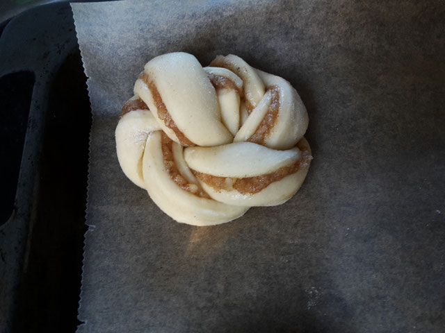 Die Knäuel so aufs Backblech legen, dass sich das Ende unter dem Gebäck befindet.